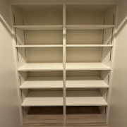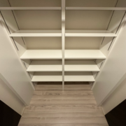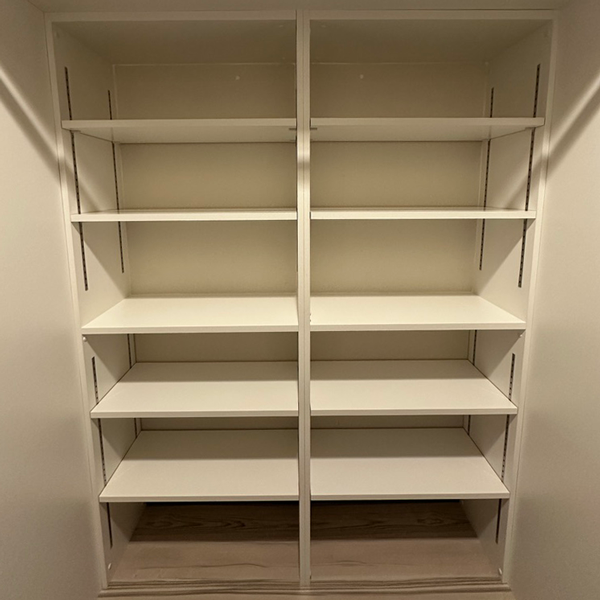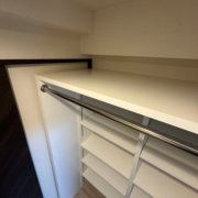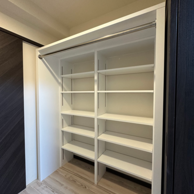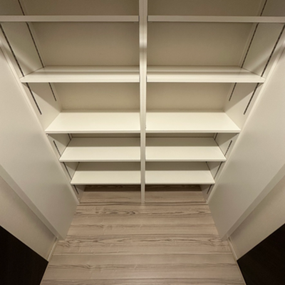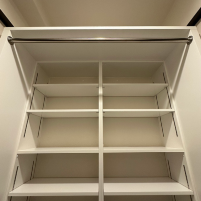 お部屋とお部屋の間にあるウォークスルークローゼットの使い勝手を向上させる収納が欲しいということで、現地での打ち合わせを経て制作しました。
