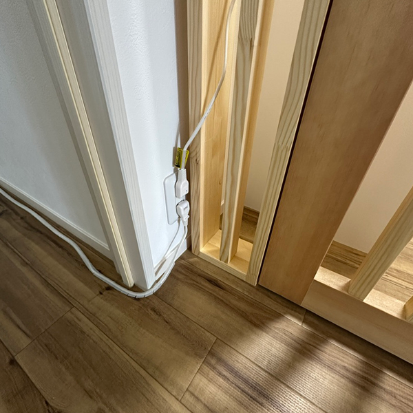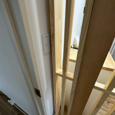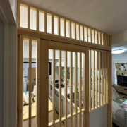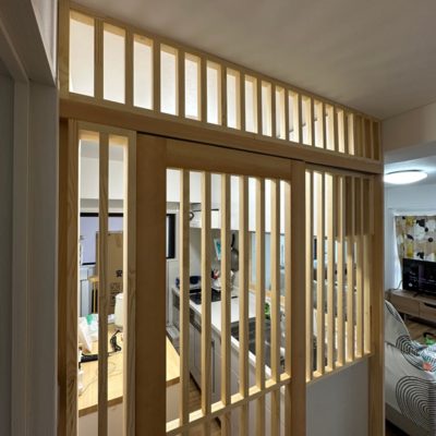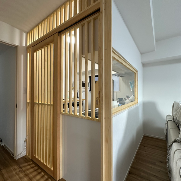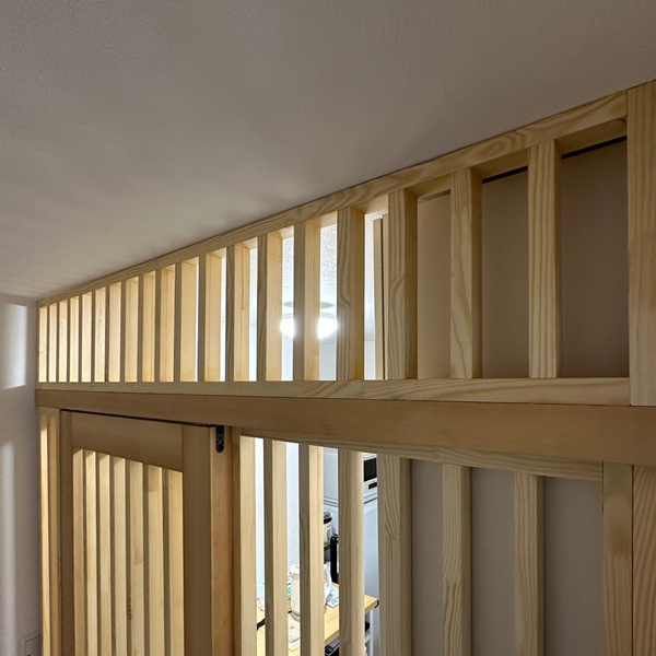 パイン材の天然オイル仕上げで制作した猫柵。パインは柔らかい木材なので、しがみついて登ったり頻繁に噛んだりしてしまう猫ちゃんだと傷が目立つためあまり向きませんが、コストを抑えられるのが利点です。今回は、猫ちゃんの性格を踏まえてこの仕様をお選びいただきました。天井付近を塞ぐ欄間格子は、構造によっては必須ではありません。ただ、木登りが得意な猫ちゃんは上部の隙間から柵を乗り越えてしまう可能性があるので、これも猫ちゃんの性格や、意匠のお好みから選択していただいています。キッチンカウンター正面は、格子より開放感のあるクリアガラスで塞ぎました。食器の受け渡しができるような開閉式にもできますが、今回はフィックス窓になっています。現地採寸の際に照明スイッチと干渉することが分かったため、壁際の廊下側には空間ができるよう設計しました。コンセントも格子戸の隙間をうまく活かしてキッチンの内外で使用できます。引き戸は開閉時にゆっくり動く、安全なソフトクローズ仕様です。