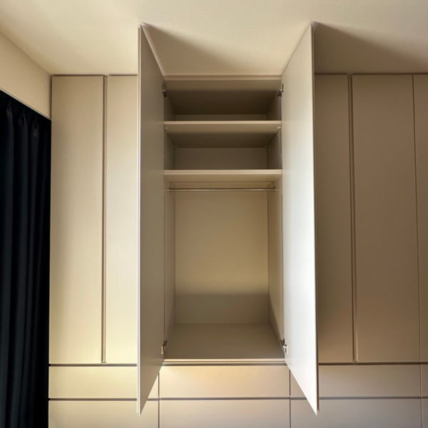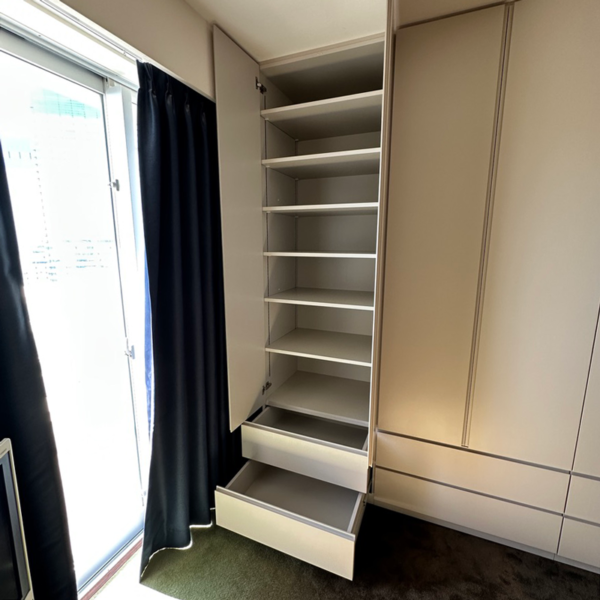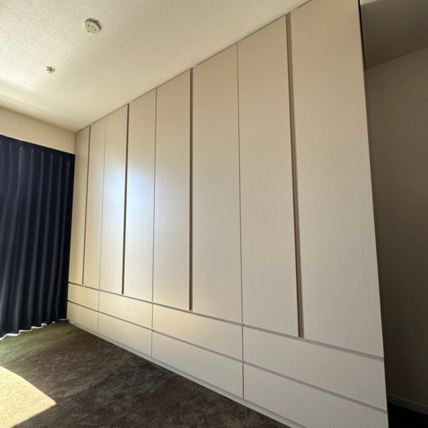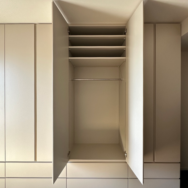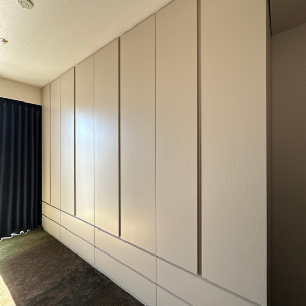 寝室のウォークインクローゼットの使い勝手を向上させるべくプチリフォームを検討しているとのご相談で現地を拝見しました。構造上大掛かりな施工になる反面得られるメリットが少なそうと結論し、打ち合わせの末、他のスペースをクローゼットとして活用できるようにする特注キャビネットを製作することになりました。
