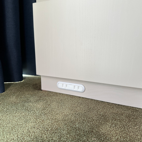 キャビネットの正面にはベッドと通路のスペースを、右手には既存のウォークインクローゼットの出入りスペースを確保して、支障のないよう寸法想定をした特注家具です。