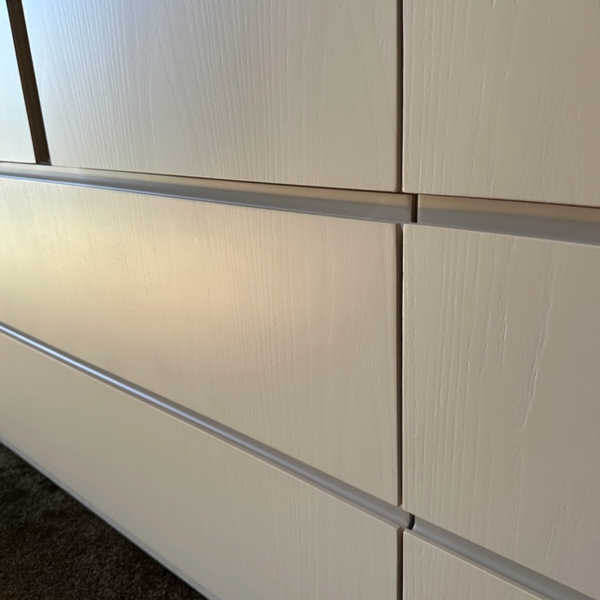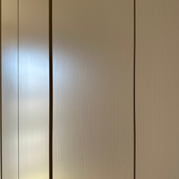 表面の材質はタモで、白とグレージュの中間にあたる絶妙な染色ウレタン塗装で仕上げました。