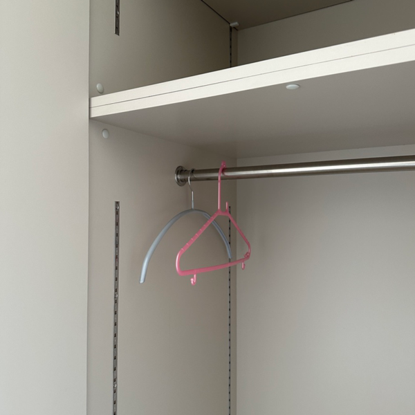 クローゼット部分にも可動棚用のレールを取り付けて、使い方を変えることもできるようにしています。