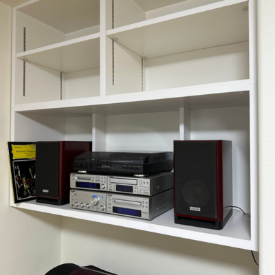 吊り戸棚はオーディオセットを置く場所として役割を決め、お持ちの機器が入る寸法に設計しました。