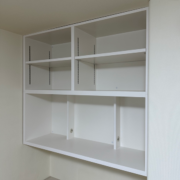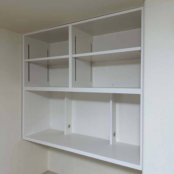 新たに吊り戸棚を設けて、上から下まで全面活用できる収納スペースになりました。