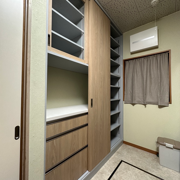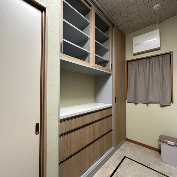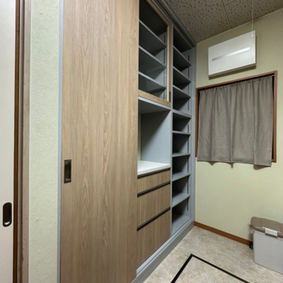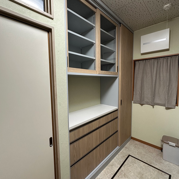 パントリーが欲しい位置に分電盤と窓があり開戸がつけられないことを悩んだお客様が引き戸にするアイデアを思いつき、当社に製作のご相談をいただきました。