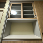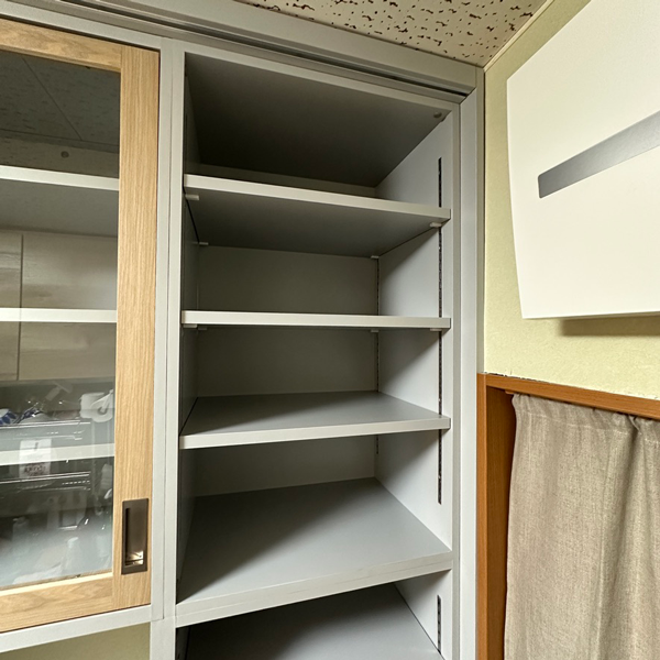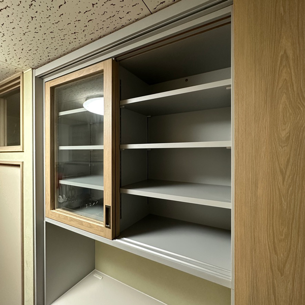 引き戸はカップボード全体の幅を端から端までスライドする仕様で、左・中央・右のうちいずれか2箇所を同時に使えるレイアウトになっています。
