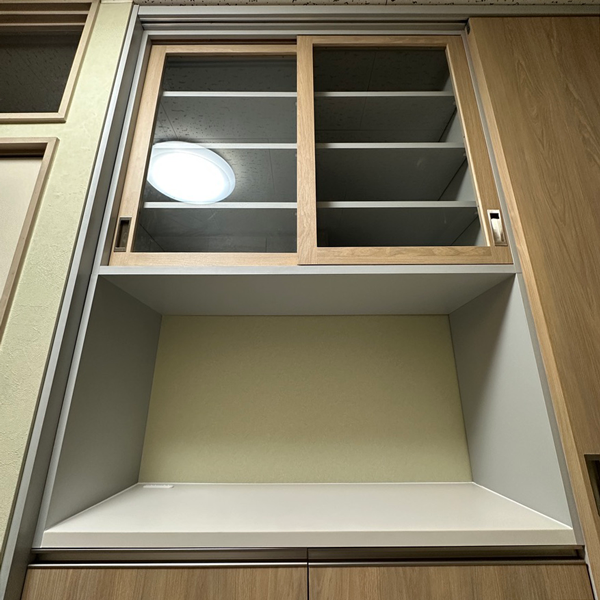 食器棚の上部収納はガラス引き戸で内部が見える仕様。