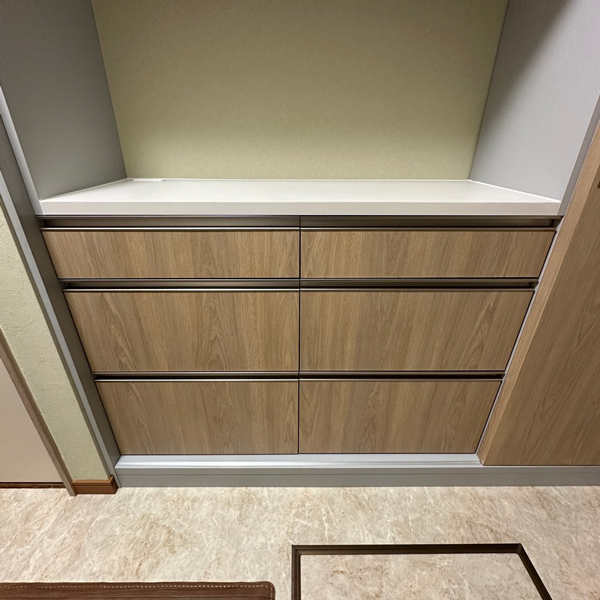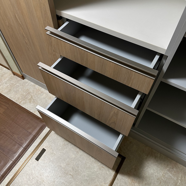 引き出しの手掛けはレール引手で、シルバーよりも明るい木目調と相性の良いステンカラーを採用しました。