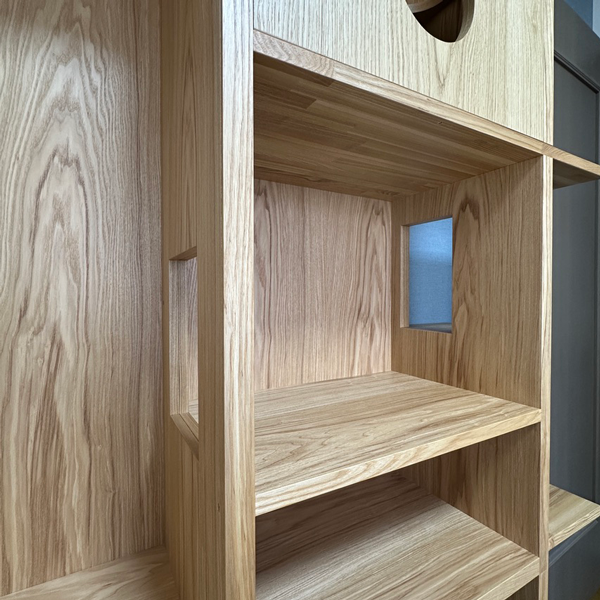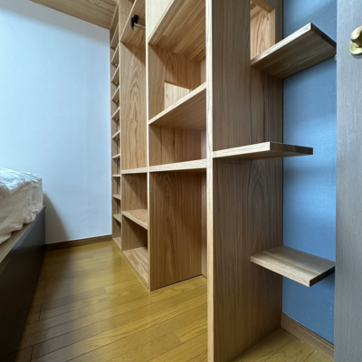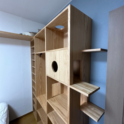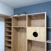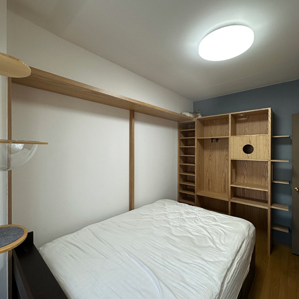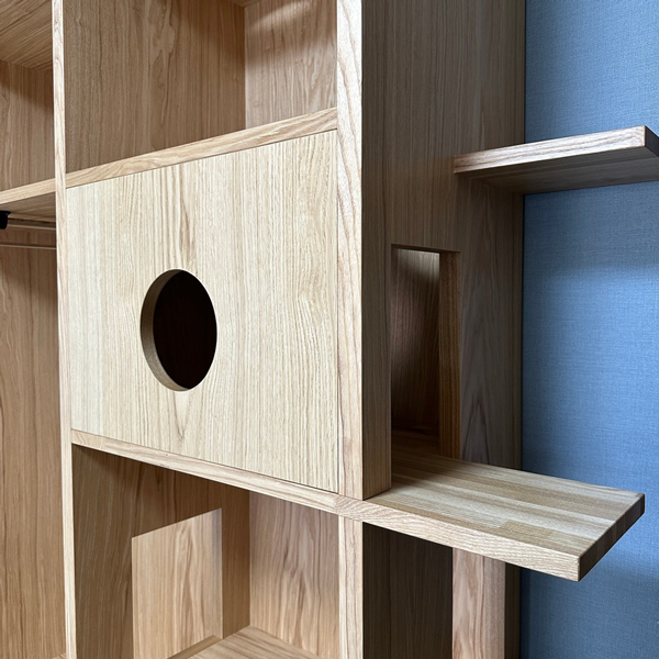 ホームページから問い合わせをいただいたお客様。寝室の収納家具について打ち合わせを進めるなかで、せっかくならオーダーメイドの自由度を活かして猫ちゃんが楽しめる家具にしようと、設計を調整していきました。