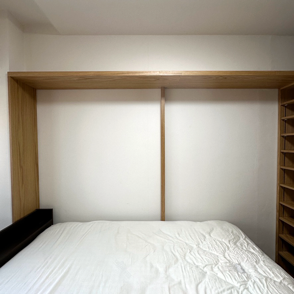 ベッドまわりに通路を確保するため家具全体の奥行きを小さくする必要があり、コート掛けは横並びではなく正面から縦方向に掛ける仕様になりました。