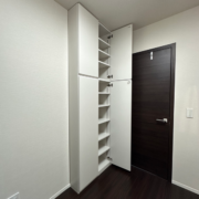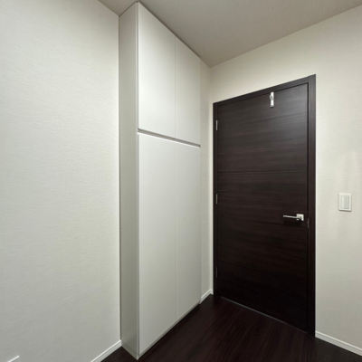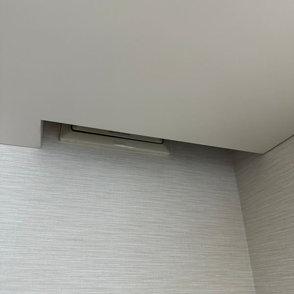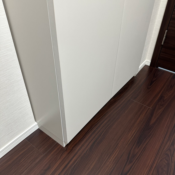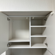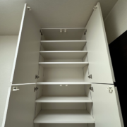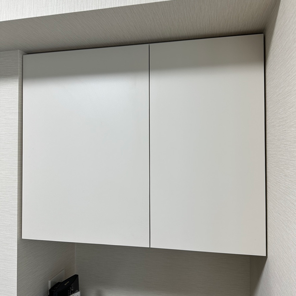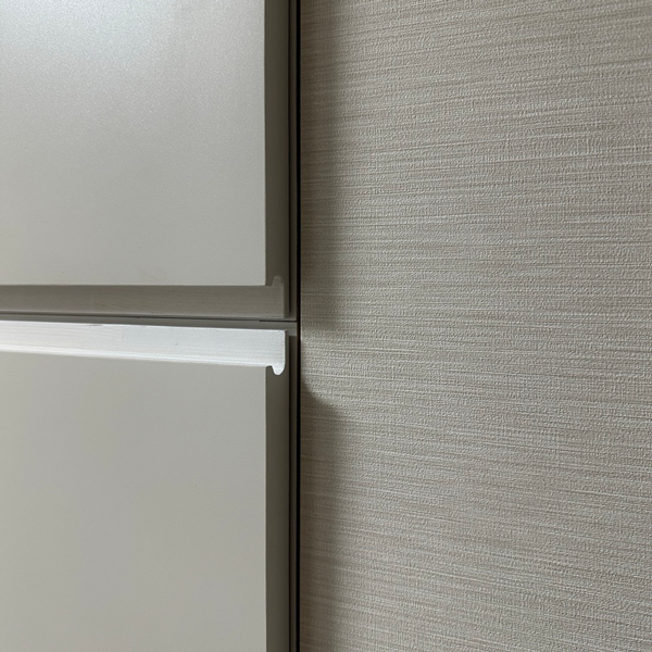 搬入の都合から上下に分割しています。分割位置はなるべく広範囲を一目で見渡したいというご希望から、お客様の身長くらいに設定しました。分割位置があまり高い位置だと上の扉を開閉するのが大変になるので、些細なようで大事なポイントです。少しでも収納量を多く取って綺麗に収めることを考え、壁の奥行きに合わせた箱に扉だけ飛び出る寸法にしました。扉の手掛けはスマートで人気のJ字型加工です。部屋の扉は備え付けのストッパーで90度で止まるようになっていることが現地採寸で確認できたので、製作する家具はスペース上最大限の容量を確保できました。棚板は可動式で、扉には地震の際に揺れを感知して開かないようにロックする耐震ラッチを取り付けています。既存のダイニングカウンター上のスペースには吊り戸棚を取り付けました。背面に換気口があり、あまり使わないということでしたが念の為使えるギリギリの寸法で空間を残す設計にしました。一見分かりにくいですが換気口を避けた右下部分のみ奥行きが違うつくりになっています。