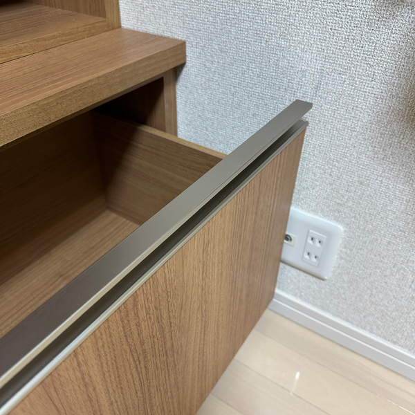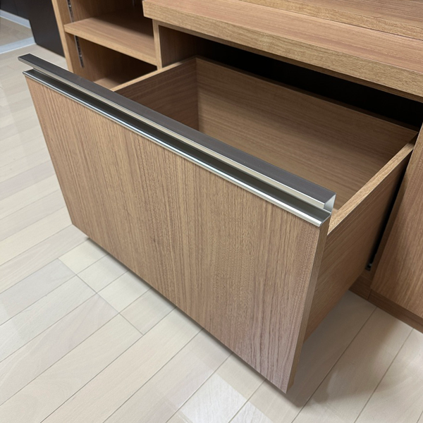 引き出しの取っ手は木目と相性の良いステンカラーのレール引手です。