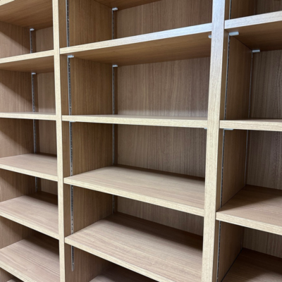 カウンターのほかは棚板可動式の本棚で、材質は木目調のポリエステル化粧板です。