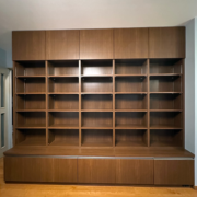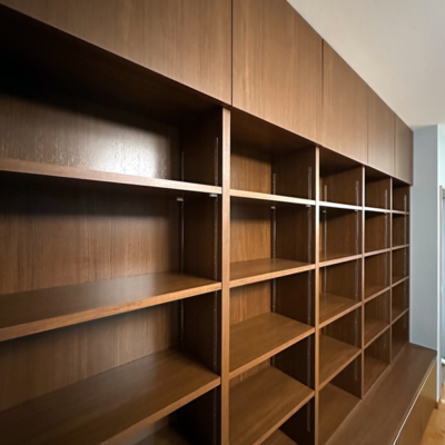中段はオープン棚で棚板は可動式。仕舞う書籍を想定して棚板の枚数を設定しています。