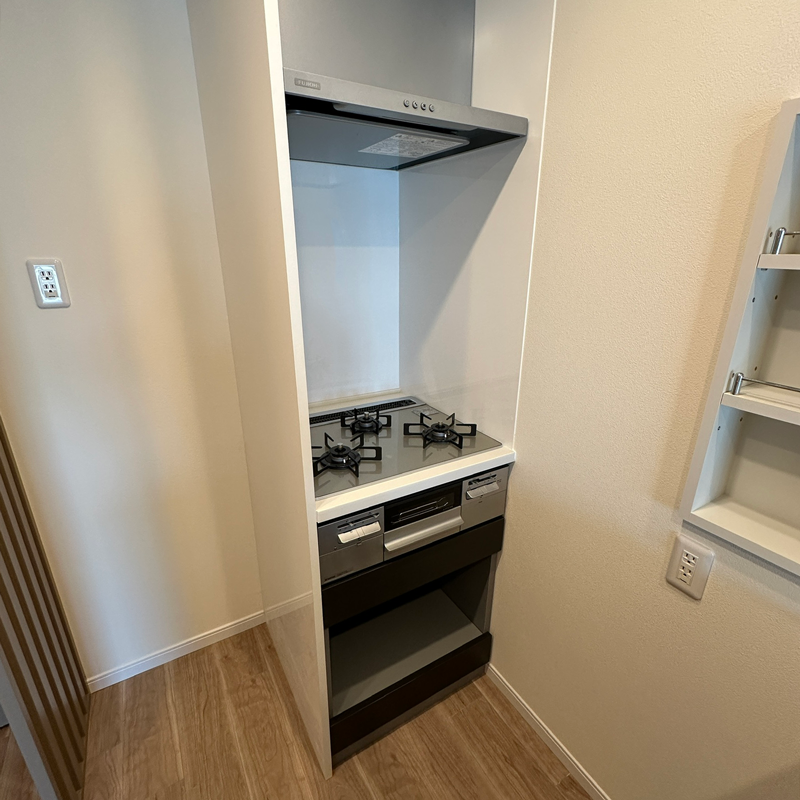 収納の不足を補うため、間の壁面にニッチ収納を設けています。ガスコンロの下はコンセント付きのフリーな収納スペースで、底板がスライドする仕様になっています。打ち合わせでは炊飯器やトースターをここに置き、電子レンジは冷蔵庫の上に置くことを想定しました。
