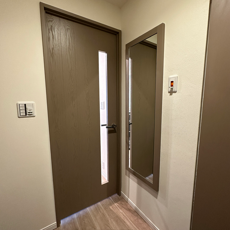 リビングドアの脇には姿見を交換可能なつくりで取り付けています。