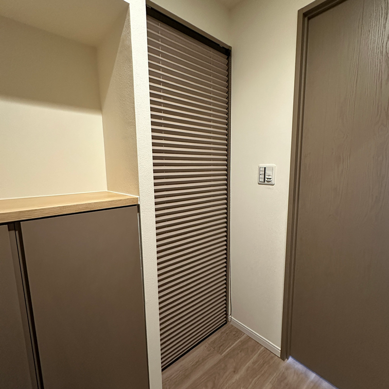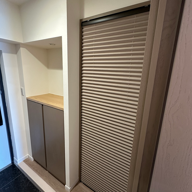 リフォーム前は扉がついていましたが、開閉が億劫になると考えてプリーツスクリーンで塞ぐ仕様に変更しました。普段は上げっぱなしで使用して、来客時のみ下げるという想定です。