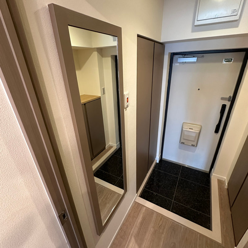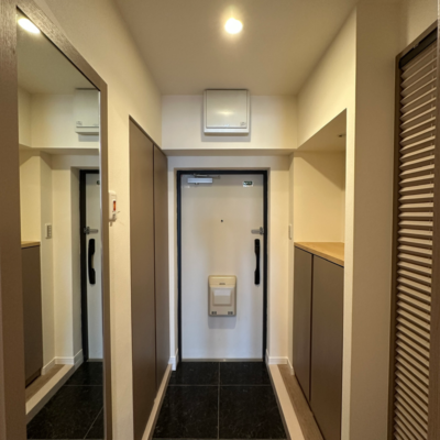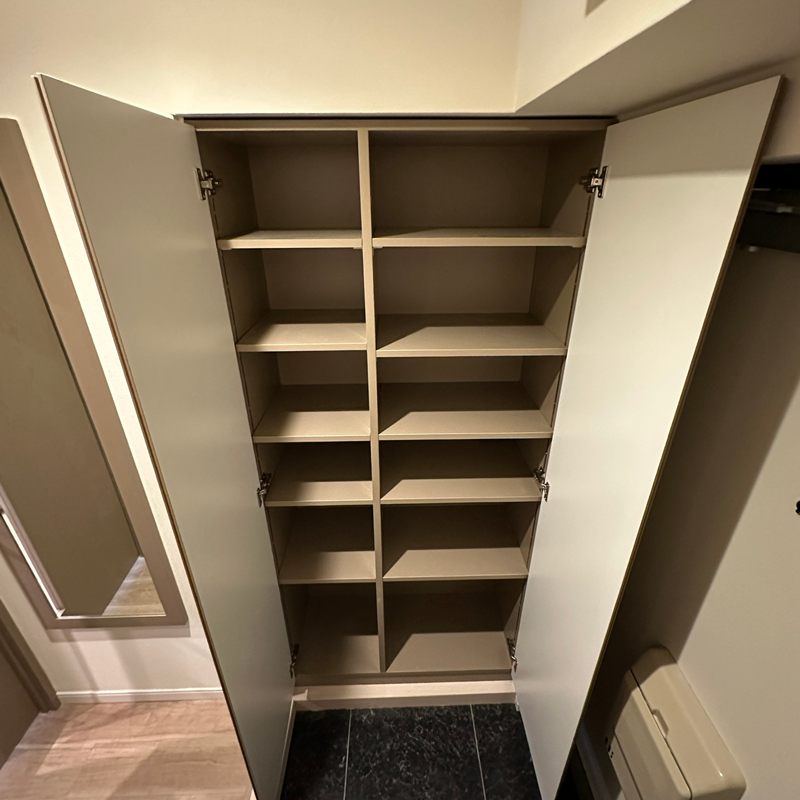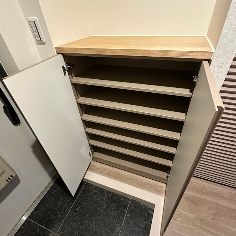 玄関の両側はどちらもカウンターになっていましたが、片側は扉付きの全面収納に変更しました。