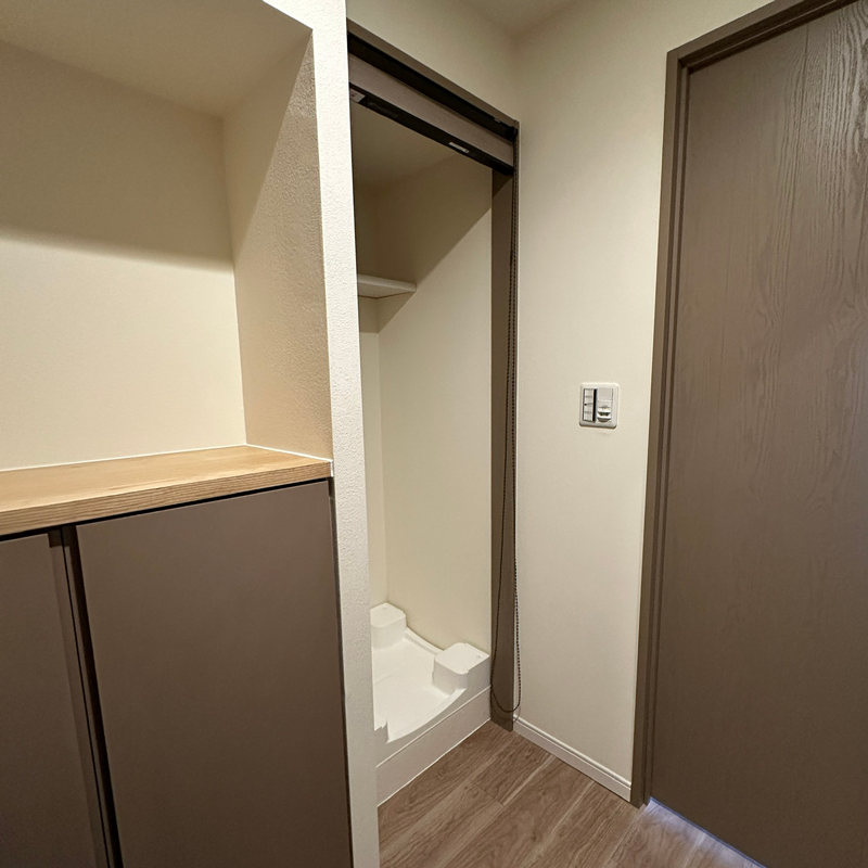 洗濯機置き場は位置を変えずに防水パンや棚板、三方枠を新調しました。