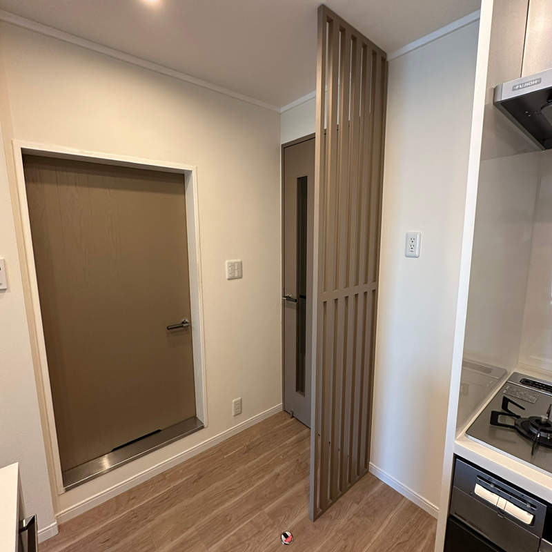 冷蔵庫スペースの脇には建具と同じ天然木の格子状パーテーションを設置し、冷蔵庫背面の配線などが目立たないようにしています。