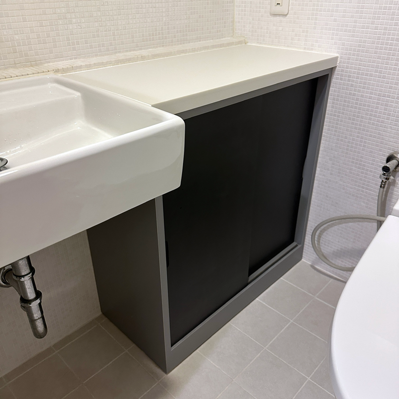 左手の手洗いボウルは洗面台の役割になるため、コスメや洗面用品を置けるよう、奥に向かって人工大理石のカウンターを伸ばしています。
