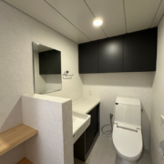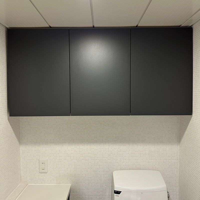掃除用品やトイレットペーパーの買い置きなどを仕舞えるように、幅広の吊り戸棚も取り付けました。