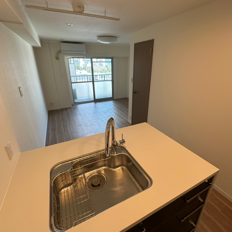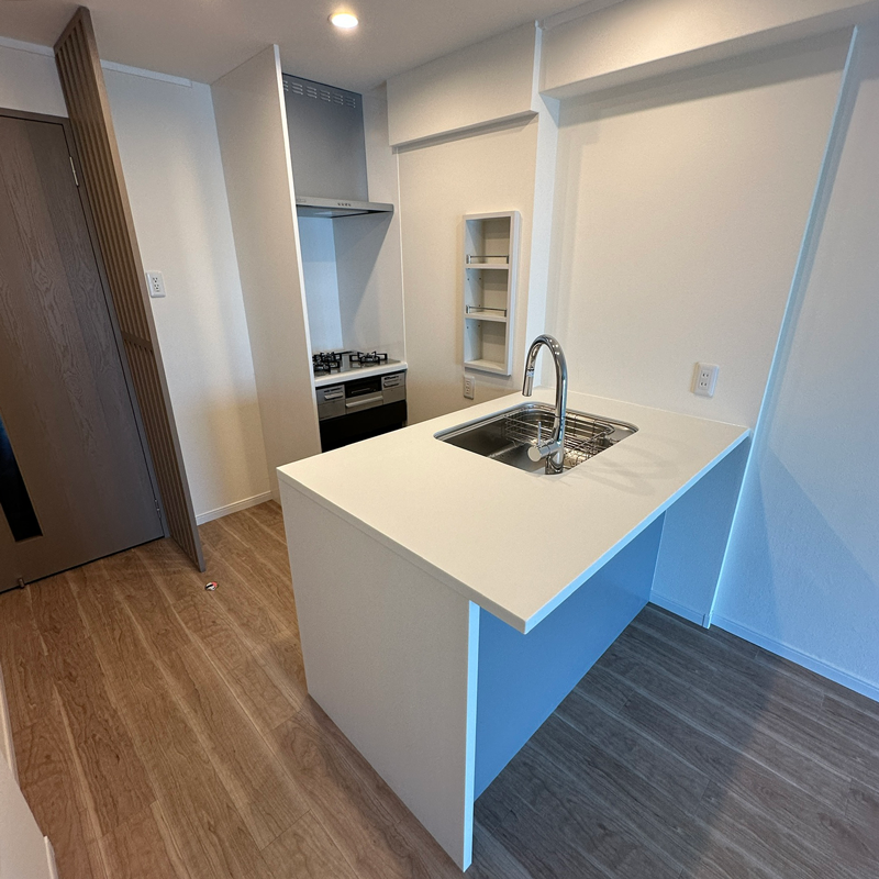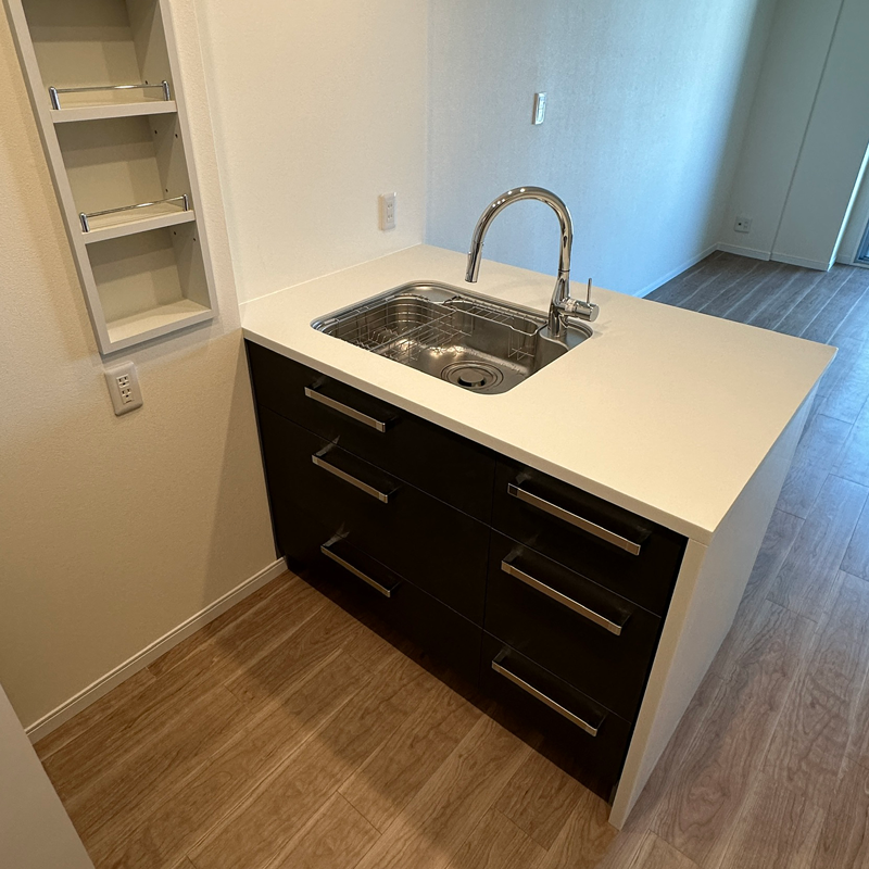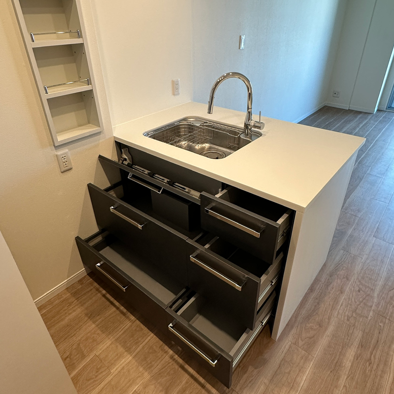 キッチンは自社工場で製作した特注キッチンで、解体後に残った壁の位置や寸法を確認した上で設計しています。