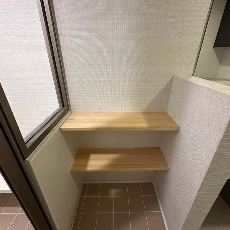 脱衣場にはウレタン塗装で仕上げた天然木のカウンター棚を設置。左右と背面の3面で固定し強度を確保しているので、収納が足りなければ市販の整理ボックスなどを積み上げていくことができます。
