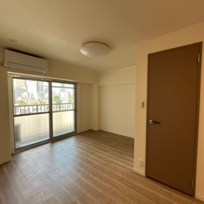 右奥にベッド、左側にソファとTVを置くレイアウト想定で、間仕切りは設けていません。